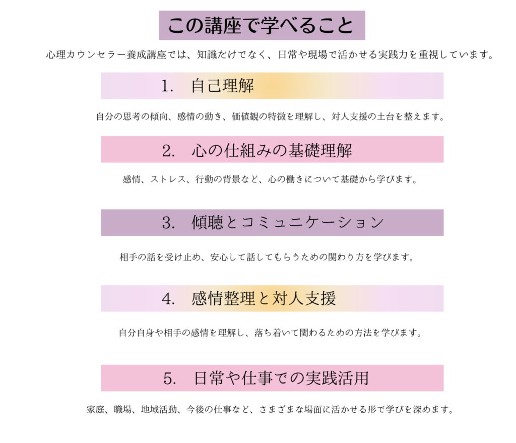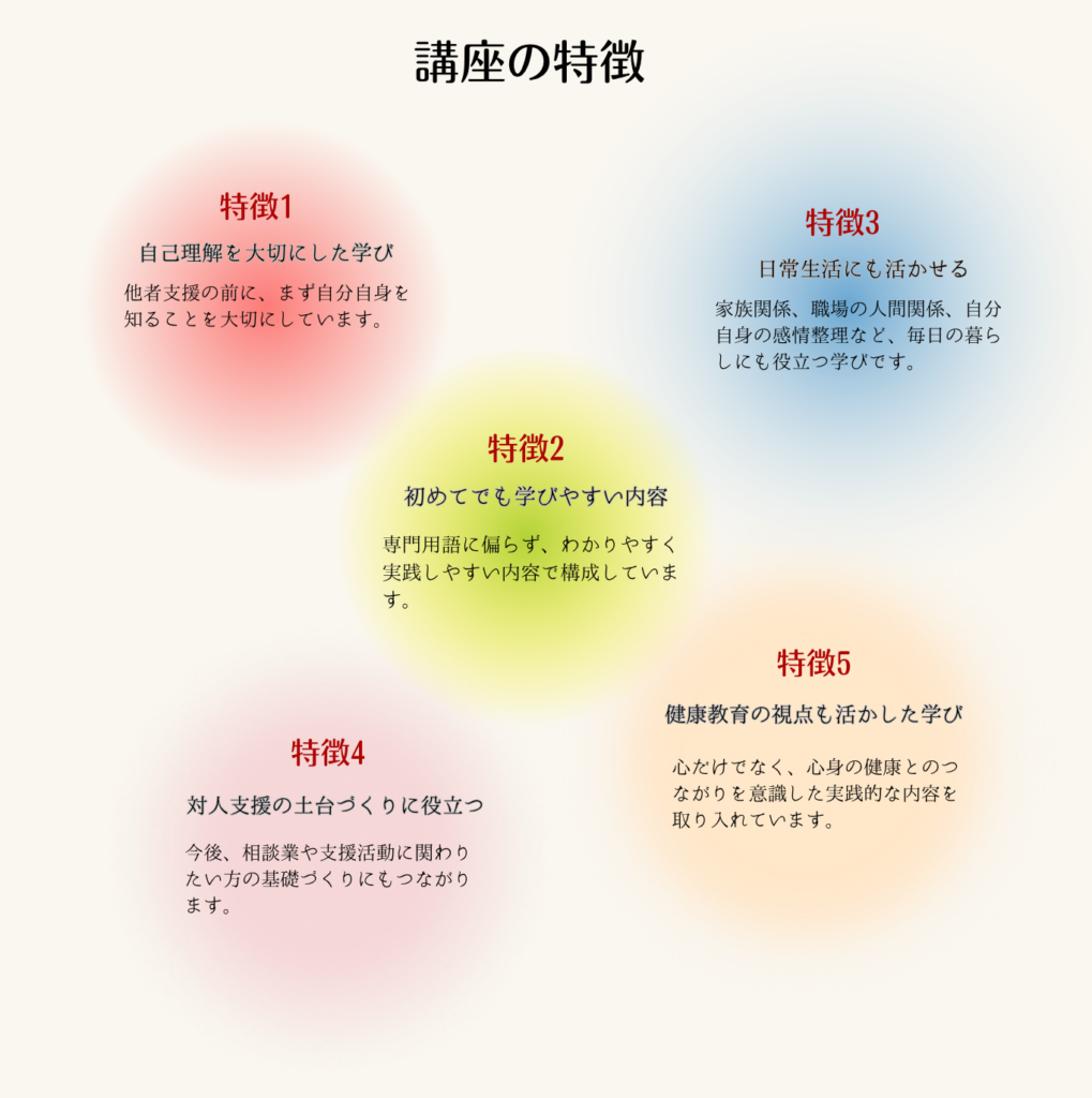 講座では、自己理解、傾聴、感情整理、コミュニケーション、対人支援の基礎などを、日常生活や仕事に活かしやすい形で学んでいきます。
